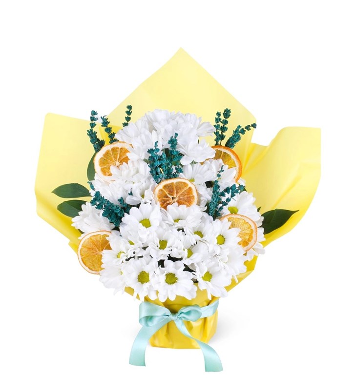 İstanbul Çiçekleri tasarım ekibi tarafından özenle hazırlanmış olan bu aranjman, hem göz alıcı hem de anlam yüklü bir hediyedir. Yaklaşık 30-35 cm boyutundaki bu şık aranjman, saflığı ve masumiyeti simgeleyen beyaz papatyalar, huzur veren kokusuyla tanınan lavanta dalları ve canlılık katan dekoratif limon dilimleriyle harmanlanarak hazırlanmıştır. Canlı sarı ambalajı ve zarif yeşil kurdelesiyle tamamlanan bu aranjman, ister özel günlerde ister küçük ama anlamlı bir sürpriz yapmak istediğinizde mükemmel bir tercih olur. Tazeliğiyle yaşam alanlarına neşe katan bu aranjman, hem göze hem ruha hitap eden doğal ve şık bir hediye alternatifi sunar.