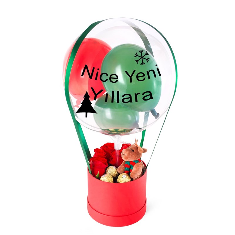 Yılbaşı Desenli Kırmızı Güllü Geyikli Ferrerolu Balon Kutusu