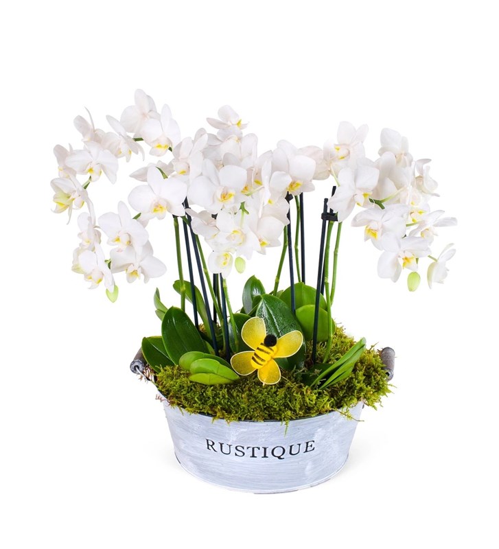 Ürünün boyutu 40-45 cm aralığındadır. 8 Dal Beyaz Midi Orkide Aranjmanı White Heaven, saflığın ve zarafetin mükemmel bir birleşimidir. Beyaz orkide çiçekleri, sade ve şık tasarımıyla mekânınıza huzur ve zarafet getirir. Bu özel aranjman, 8 dal orkidenin zarif ve gösterişli görüntüsüyle görsel bir şölen sunarken, her ortamda sakinleştirici bir atmosfer yaratır. White Heaven, beyaz orkidenin saf ve zarif tonlarını bir araya getirir. Çiçeklerin ince yapısı ve göz alıcı güzelliği, mekâna zarif bir dokunuş katar. Şık bir seramik saksı içinde sunulan bu aranjman, minimalist tasarımıyla orkidenin doğal zarafetini vurgular. Saksının doğal yosunlar veya taşlarla süslenmesi, aranjmanın doğallığını ve estetik görünümünü pekiştirir. 8 Dal Beyaz Midi Orkide Aranjmanı White Heaven, oturma odası, yemek masası, ofis veya herhangi bir iç mekânda etkileyici bir odak noktası oluşturur. Ayrıca, düğün, yıl dönümü, doğum günü, teşekkür veya kutlama gibi özel günlerde anlamlı ve şık bir hediye alternatifi olarak tercih edilebilir. Bakımı: Işık: Orkide, doğrudan güneş ışığından kaçınarak parlak, dolaylı ışık alan bir yerde büyür. Güneş ışığına doğrudan maruz kalmak, yaprakların yanmasına ve çiçeklerin solmasına neden olabilir. Sıcaklık: Aşırı soğuk ya da aşırı sıcak hava, orkidenin sağlıklı gelişimini engelleyebilir. Odanın nem seviyesini de göz önünde bulundurmak gerekir. Sulama: Orkide bitkisini sularken dikkatli olunmalıdır. Orkide, fazla suyu sevmez, bu nedenle toprağın üst kısmı kuruduğunda sulama yapılmalıdır. Sulama sırasında suyun saksının tabanında birikmemesine özen gösterin. Saksı altındaki delikler, suyun hızlı bir şekilde tahliye olmasını sağlamalıdır. Nem: Orkide nemli ortamlardan hoşlanır. Nem oranı düşük ortamlarda orkidenin yaprakları kuru ve solgun görünebilir.