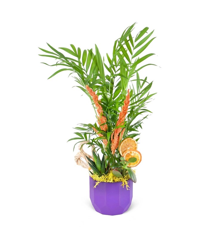 Ürün boyutu 25-35 cm aralığında, saksı çapı ise 8,5 cm’dir. Chamadora aranjmanı, sukulentlerin dayanıklılığı, kuru portakal dilimlerinin sıcak renkleri ve kuru bitkilerin doğal dokusu ile benzersiz bir estetik sunar. Sukulentler, minimal bakım gereksinimi ve taze görünümüyle aranjmanın temelini oluştururken, kuru portakal dilimleri sonbaharın sıcak renklerini yansıtarak aranjmana enerjik bir dokunuş katar. Kuru bitkiler ise doğal dokuları ve zarif duruşlarıyla, bu aranjmanı zamansız ve şık kılar. Bu aranjman, her mekâna doğal bir hava katarken, uzun süre bozulmadan taze ve güzel kalmasıyla da pratik bir dekorasyon seçeneğidir. Hem modern hem de rustik tarzda alanlara uyum sağlayan Chamadora aranjmanı, doğal güzellikleri ve sıcak renkleriyle dikkat çeker. Aranjmanın bakımında püf noktalar; Chamaedorea: Toprağı hafif nemli kalacak şekilde sulayın. Sulamalar arasında toprağın üst kısmının kurumasını bekleyin; fazla su kök çürümesine neden olabilir. Sukulent: Sulama yaparken toprağın tamamen kurumasını bekleyin. Haftada bir sulama genellikle yeterlidir. İyi drene olan toprak kullanın ve sulama sonrası fazla suyu boşaltın. Derin sulama yaparak köklerin su almasını sağlayın. Kışın su ihtiyacı azalır, bu yüzden daha az sulayın. Ayrıca suyun yapraklara değmemesine dikkat edin.