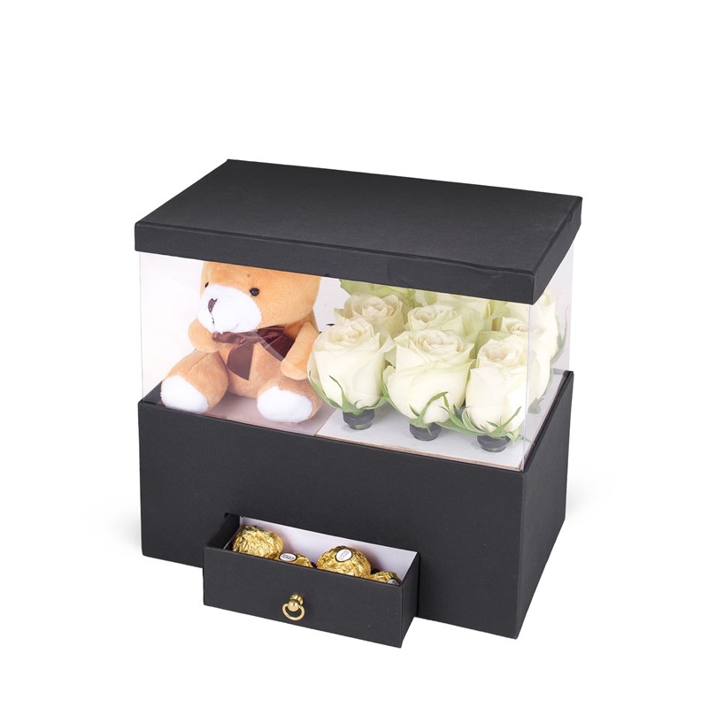 Asetatlı Çekmeceli Kutuda Ayıcıklı Çikolatalı Beyaz Güller