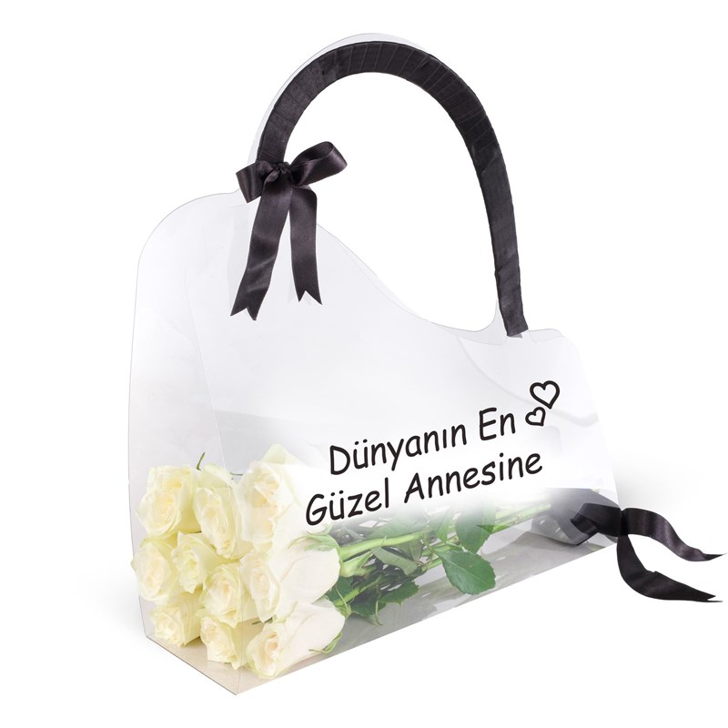 Kalpli asetatlı çantada ithal 10 gül bulunmaktadır. Üzerine istediğiniz yazı yazılmaktadır. 34cm genişlik 38 cm yükseklik