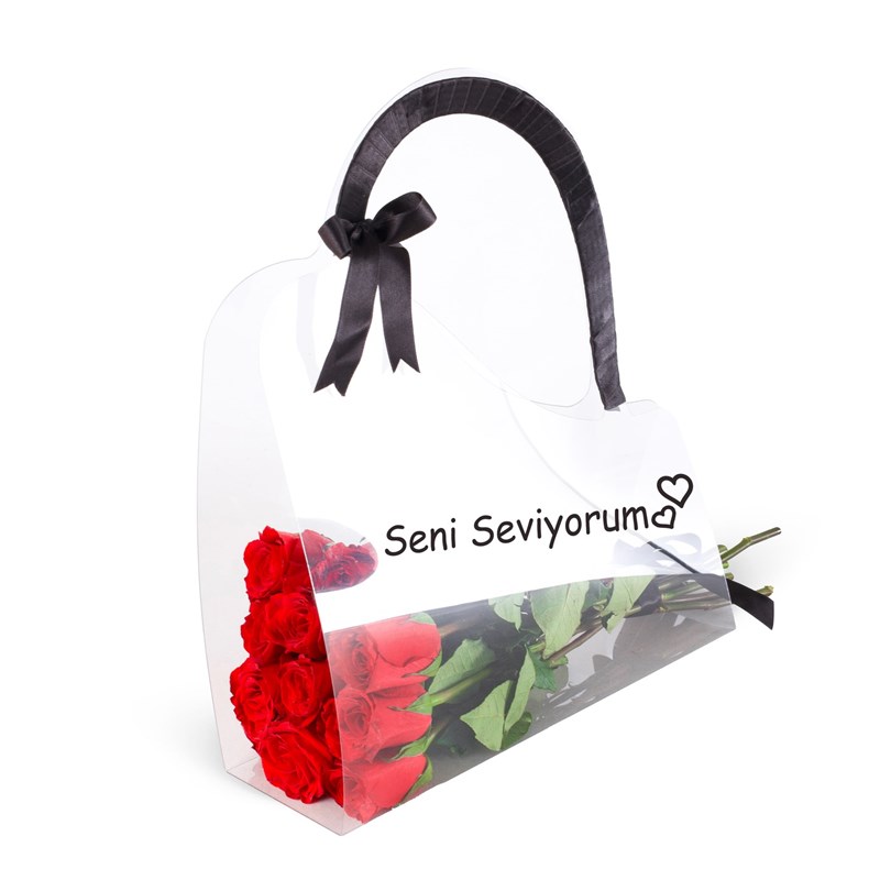 Kalpli asetatlı çantada ithal 10 gül bulunmaktadır. Üzerine istediğiniz yazı yazılmaktadır. 34cm genişlik 38 cm yükseklik