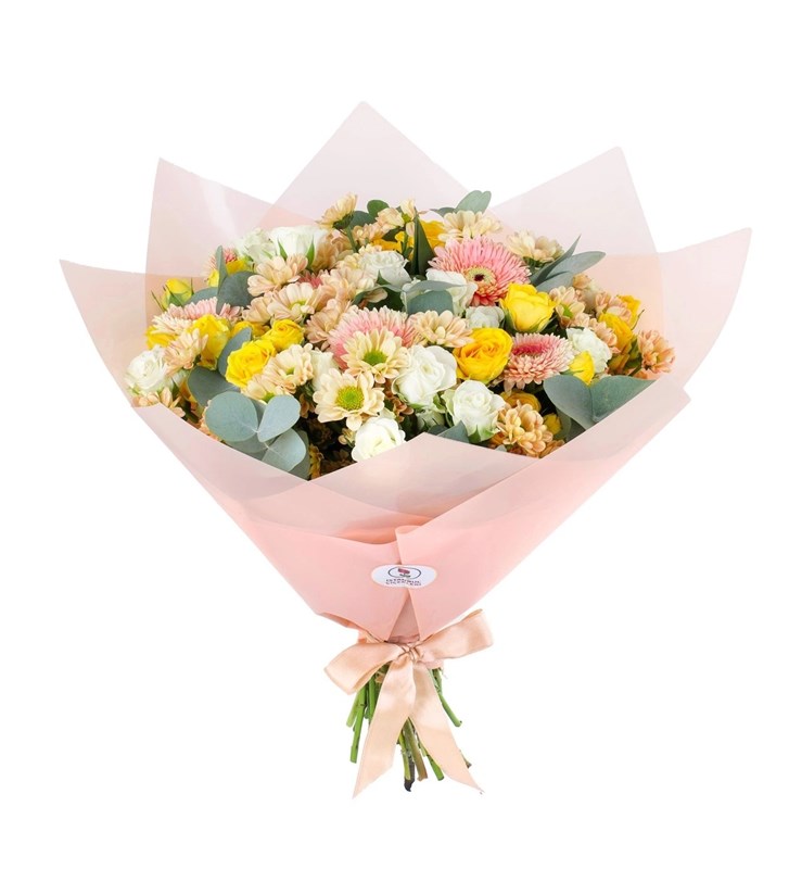 Ürünün boyutu 30-35 cm aralığındadır. Beyaz ve sarı çardak çiçeklerinin saflığı, pembe gerberaların zarafeti, papatyaların içtenliği ve okaliptusun ferahlatıcı yeşil dokunuşu ile bu buket, sevginin ve doğanın en güzel haliyle buluşuyor. Okaliptus, buketi tamamlayarak doğal bir tazelik ve huzur katar, her bir çiçek ise duygularınızı zarif bir şekilde ifade eder. Buketlerin bakımında püf noktalar; * 2 günde bir suyunun değişmesi gerekir. * Her su değişiminde bitkinin alttan kökleri 1 cm kadar kesilmelidir. * Çiçeklerin suyunun devamlı berrak olmasına dikkat edilmesi tavsiye edilir.