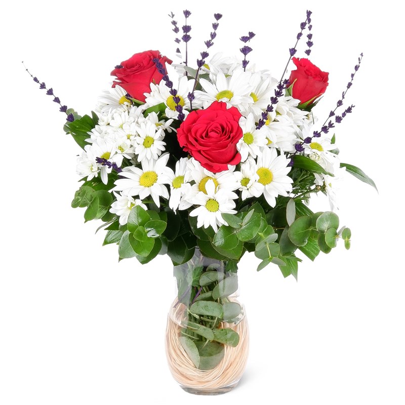 Ürünün boyutu 30-45 cm aralığındadır. Vazo içerisinde kırmızı gül, papatya,mor lavanta, ruskus ve okaliptus bulunmaktadır. Gül bakımında püf noktalar; * 2 günde bir suyunun değişmesi gerekir. * Her su değişiminde alttan kökleri 1 cm kadar kesilmelidir. * Suyun devamlı berrak olmasına dikkat edilmesi önerilir.