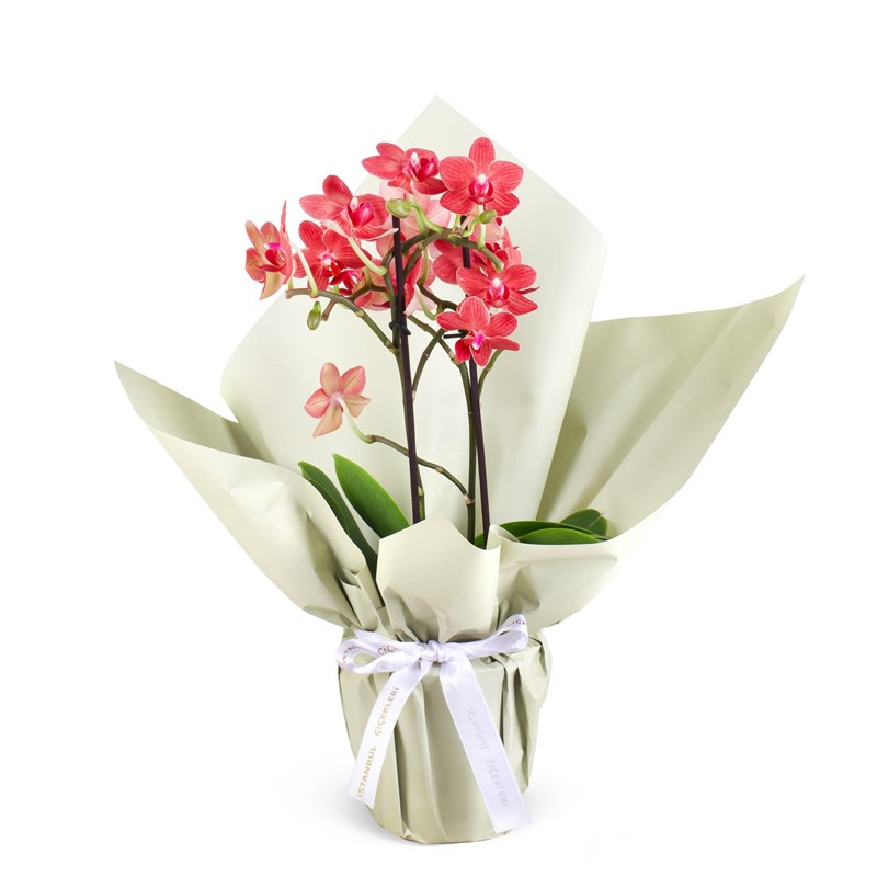 Ateş Turuncu Orkide Aranjmanı Multi Midi Çift Dallı, çift dallı yapısı ve 30-35 cm boyuyla kompakt ama etkileyici bir duruş sergiler. Evinize ya da sevdiklerinizin yaşam alanlarına sofistike bir dokunuş katar. İki dallı yapısıyla hem gösterişli hem de dengeli bir duruş sergiler. Orkidenizin sağlıklı gelişimi için direkt güneş ışığından uzak, aydınlık bir ortam tercih edin; sulamayı ise haftada 1 kez, toprağın nem durumuna göre yapmanız yeterli olacaktır. İstanbul içi verdiğiniz siparişlerde aynı gün teslimat hizmetimizle, sevdiklerinize zamanında ve taze çiçekler ulaştırmanın mutluluğunu yaşıyoruz. Hızlı Teslimatlı Orkide