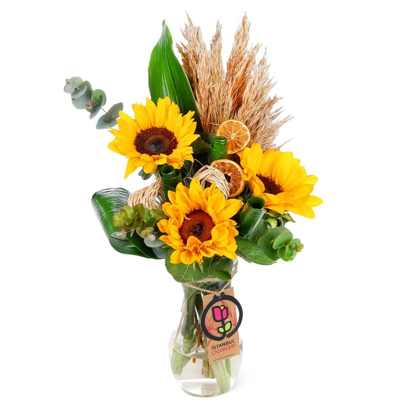 Ürün boyutu ortalama 40-45 cm'dir Ayçiçeği diğer adıyla Günebakan yapısı bakımından dayanıklı bir çiçek türüdür. Sevdiklerinizi mutlu etmek ve en özel anlarınızı taçlandırmak için tercih edebileceğiniz tasarımlarımızdandır. Ayçiçekleri mutluluk, sadakat ve hayranlıkla ilişkilendirilir, bu da onları sevgi ve şefkat sembolü yapar. Sarı rengiyle baharı, şansı ve mutluluğu anımsatmaktadır. Ay çiçeği bakımı; 1. Üç günde bir suyu klorsuz dinlenmiş su ile değiştirilmelidir. 2. Her su değişiminde alttan yapılan 0.5-1 cm’lik sap budaması çiçeğin daha diri kalmasını sağlar. 3. Çiçek saplarının en alt kısımları kontrol edilmeli, sararma veya kahverengileşme görülürse bu kısımlar makas yardımıyla uzaklaştırılmalıdır.