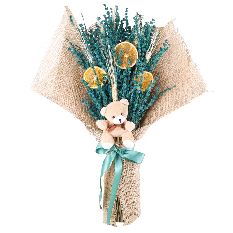 Ürünün boyutu 50-60 cm arasındadır. Ayıcıklı turkuaz lavanta buketi, zarafeti, huzuru ve sıcak sevgiyi bir araya getiren anlamlı ve etkileyici bir hediyedir. Lavanta, dinginliği, sadakati ve sonsuz sevgiyi simgelerken, yumuşacık bir ayıcık, içten bir şefkatin ve samimi duyguların sembolüdür. Bu birleşim, hem görsel olarak hem de duygusal anlamda güçlü bir mesaj taşır. Lavanta, genellikle rahatlatıcı etkisi ve hoş kokusuyla bilinir. Stresli zamanlarda huzur getiren bir enerji taşır ve bu nedenle sevdiğiniz birine destek ve sakinlik mesajı vermek için harika bir seçenektir. Ayıcık ise tatlı ve sevecen bir jest olarak, hediyeyi alan kişinin yüzünde bir gülümseme yaratır. Buketlerin bakımında püf noktalar; *Güneşten ve rutubetten uzak tutunuz. *Kuru buket olduğu için suya koymayınız.