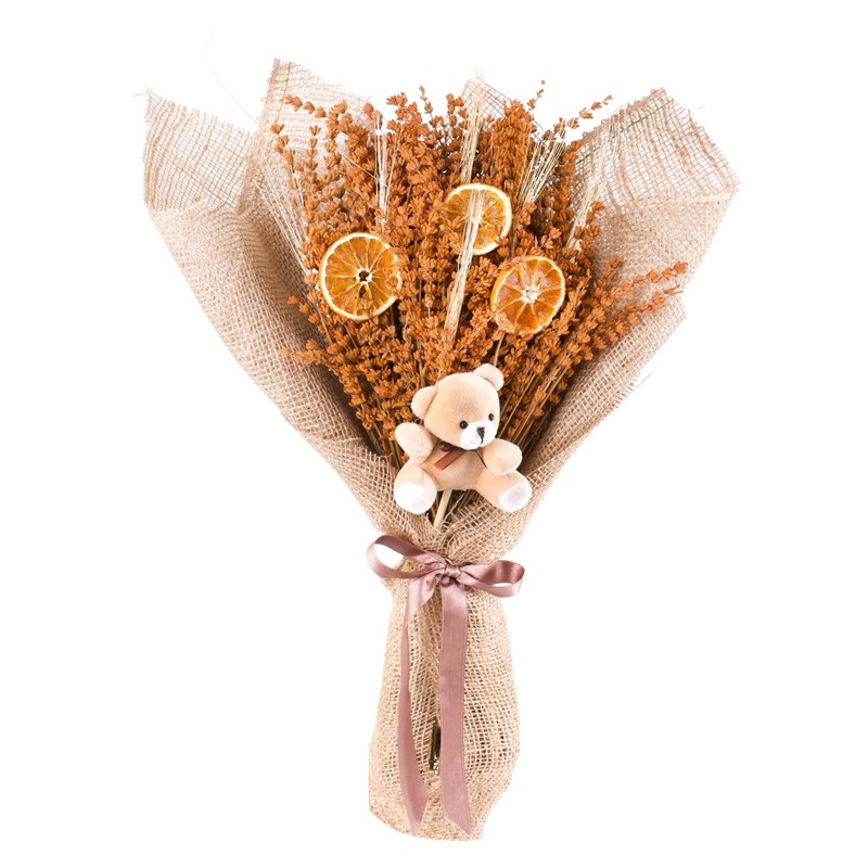 Ürünün boyutu 50-60 cm arasındadır. Ayıcıklı turuncu lavanta buketi, zarafeti, huzuru ve sıcak sevgiyi bir araya getiren anlamlı ve etkileyici bir hediyedir. Lavanta, dinginliği, sadakati ve sonsuz sevgiyi simgelerken, yumuşacık bir ayıcık, içten bir şefkatin ve samimi duyguların sembolüdür. Bu birleşim, hem görsel olarak hem de duygusal anlamda güçlü bir mesaj taşır. Lavanta, genellikle rahatlatıcı etkisi ve hoş kokusuyla bilinir. Stresli zamanlarda huzur getiren bir enerji taşır ve bu nedenle sevdiğiniz birine destek ve sakinlik mesajı vermek için harika bir seçenektir. Ayıcık ise tatlı ve sevecen bir jest olarak, hediyeyi alan kişinin yüzünde bir gülümseme yaratır. Buketlerin bakımında püf noktalar; *Güneşten ve rutubetten uzak tutunuz. *Kuru buket olduğu için suya koymayınız.