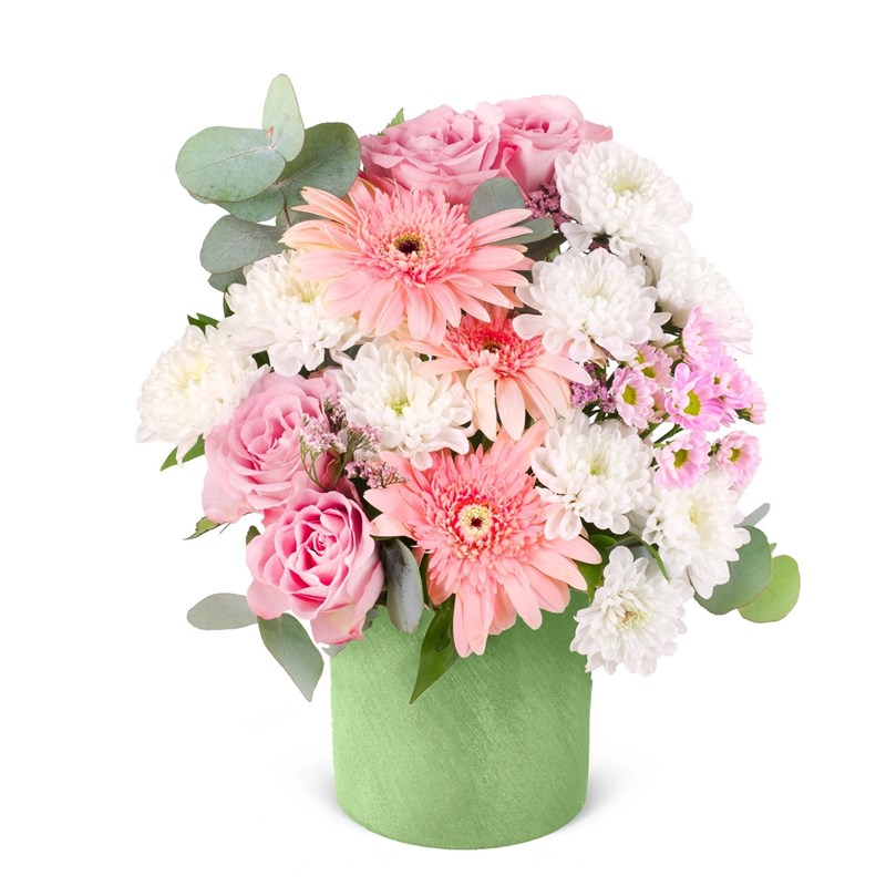 Romantik pembe tonlarının hakim olduğu bu 25-30 cm boyutundaki aranjman, pembe gerbera, lila gül ve beyaz krizantemlerin zarif birleşimiyle İstanbul Çiçekleri tarafından özenle hazırlanmıştır. Modern beyaz saksı içerisinde sunulan bu şık tasarım, özel günlerde sevdiklerinize hediye edebileceğiniz en zarif seçeneklerden biridir. Aynı gün teslimat avantajıyla sipariş verin, şıklığı kapınıza getirelim!