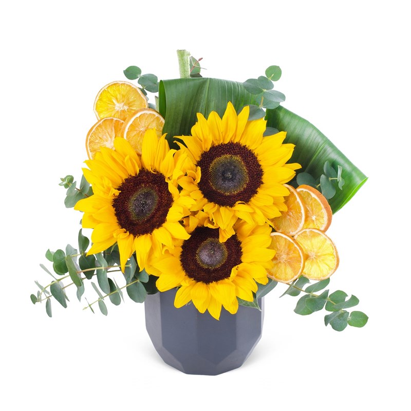Ürünün boyutu 25-30 cm aralığındadır. Doğanın enerjisi ve modern tasarımın birleştiği Beton Saksıda Ayçiçeği Aranjmanı, evinize ya da sevdiklerinizin yaşam alanlarına eşsiz bir dokunuş katıyor. Beton saksının sade ve şık görünümü, doğanın sıcak ve canlı renkleriyle bir araya gelerek benzersiz bir uyum sunuyor. Ayçiçeği, güneşi simgeleyen canlı sarı tonlarıyla neşe ve umut verir. Portakal dilimleri, aranjmana doğal bir detay ve enerjik bir hava katarak tazelik hissini artırır. Okaliptus yapraklarının dingin yeşil tonu ise huzur ve ferahlık sembolü olarak tasarımı tamamlar.