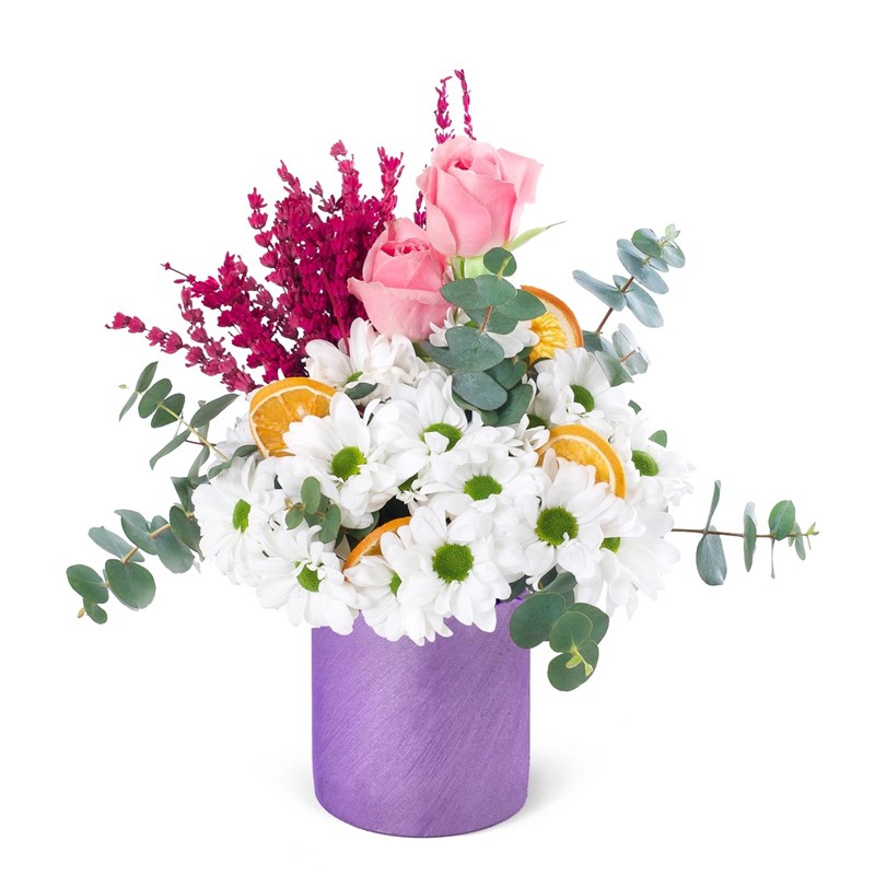 Ürünün boyutu 30-35 cm aralığındadır. Beton Saksıda Papatya Aranjmanı, sade güzelliği ve doğal zarafeti bir araya getiren eşsiz bir tasarımdır. Beyaz papatyalar, aranjmanın merkezinde yer alarak saflığı ve huzuru simgeler. Parlak beyaz yaprakları ve zarif görünümleriyle her ortama ferah bir atmosfer katar. Kuru lavanta, sakinleştirici etkisi ve doğal kokusuyla aranjmana hoş bir dokunuş eklerken, kuru portakal dilimleri, sıcak tonlarıyla tasarıma canlılık ve renk katmaktadır. Okaliptus, yeşilin taze tonları ve ferahlatıcı kokusuyla bu düzenlemeyi tamamlar, doğal bir denge ve görsel uyum sağlar. Aranjmanın yer aldığı beton saksı, modern ve minimalist tasarımıyla çiçeklerin zarafetini vurgular. Betonun sade ve güçlü yapısı, aranjmana doğal bir dokunuş eklerken, her türlü dekorasyon tarzına uyum sağlar. Bu aranjman, doğum günleri, kutlamalar, tebrik hediyeleri veya sadece sevdiklerinize zarif bir jest yapmak için harika bir seçimdir. Ayrıca evde veya ofiste dekoratif bir parça olarak kullanılabilir, mekâna hem doğal hem de modern bir hava katar. Beton Saksıda Papatya Aranjmanı, sadeliğiyle büyüleyici bir güzellik sunar ve her ortamda dikkat çeken bir detay oluşturur.