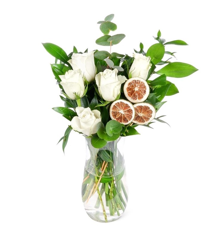 Ürünün boyutu ortalama 40-50 cm arasındadır. Sizler için özenle tasarlanmış cam aranjmanımızı sevdiklerinize hediye edebilir veya bulunduğunuz ortamı renklendirebilirsiniz. Beyaz gül, saflık, masumiyet ve temiz duyguların simgesidir. Aynı zamanda yeni başlangıçları, sadakati ve derin saygıyı ifade eder. Cam Aranjman Bakımı Hakkında Bilgilendirme; -Günlük bakımı için alt dallarının 1 cm olacak şekilde kesilmesi gerekir. -Vazoda bulunan suyun berrak olması gerekir. -2 günde bir suyunun değişmesi gerekir. -Ürünün serin yerde muhafaza edilmesi gerekir. -Solmuş veya bozulmaya başlayan ürünün yapraklarının temizlenmesi gerekir.