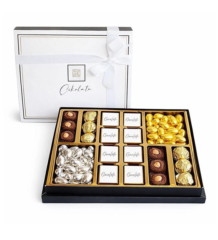 Ürünümüzde 24 adet baskı sargılı madlen çikolata,12 adet karışık spesiyal çikolata , 100 gr gümüş,100 gr gold draje bulunmaktadır. Kutu Ölçümüz 32x24x5 cm'dir Ürünlerimizde alkol veya domuzyağı gibi maddeler kesinlikle bulunmamaktadır. Stok durumuna göre çikolata çeşitleri farklılık gösterebilir. Alerjen Uyarısı : süt tozu içerir,eser miktarda fıdık,atep fıstığı,badem,yer fıstığı,susam,ceviz ve gluten içerebilir. Muhafaza Şartları: Serin ve kuru yerde (+18/22 C'de ) muhafaza ediniz. Güneş ışığına doğrudan temasta bırakmayınız . Buzdolabına koymayınız.