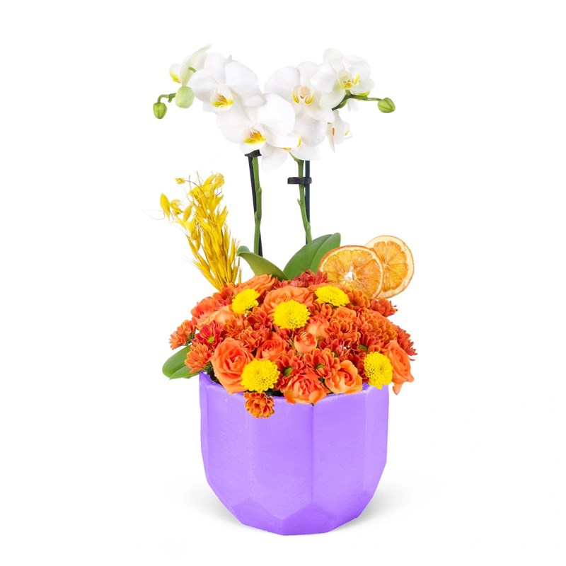 Ürünün boyutu 35-40 cm aralığındadır. Beyaz Midi Orkide Aranjmanı, zarafetin ve doğallığın mükemmel birleşimidir. Beyaz orkide çiçekleri, sadeliği ve zarif duruşuyla her mekânda dikkat çekerken, kahverengi saksı ise doğal ve şık bir dokunuş katar. Bu özel aranjman, orkidenin saf beyaz tonlarını ve kahverenginin sıcaklığını birleştirerek hem modern hem de klasik bir hava yaratır. Beyaz orkide çiçeklerinin zarif yapısı, mekânınıza sakinlik ve huzur getirirken, kahverengi saksı şıklığı ve doğallığı ile orkidenin güzelliğini ön plana çıkarır. Saksının dış kısmındaki doğal detaylar, örneğin taşlar veya yosunlar, aranjmanı daha da zenginleştirir ve doğal bir atmosfer yaratır. Bu aranjman, oturma odasından ofise, yemek masasına kadar her alanda şık bir dekoratif öğe olarak yer alabilir. Ayrıca yıl dönümü, doğum günü, kutlama veya teşekkür gibi özel anlarda anlamlı bir hediye alternatifi sunar. Zarif ve sade tasarımıyla her türlü mekâna uyum sağlar. Bakımı: Işık: Orkide, doğrudan güneş ışığından kaçınarak parlak, dolaylı ışık alan bir yerde büyür. Güneş ışığına doğrudan maruz kalmak, yaprakların yanmasına ve çiçeklerin solmasına neden olabilir. Sıcaklık: Aşırı soğuk ya da aşırı sıcak hava, orkidenin sağlıklı gelişimini engelleyebilir. Odanın nem seviyesini de göz önünde bulundurmak gerekir. Sulama: Orkide bitkisini sularken dikkatli olunmalıdır. Orkide, fazla suyu sevmez, bu nedenle toprağın üst kısmı kuruduğunda sulama yapılmalıdır. Sulama sırasında suyun saksının tabanında birikmemesine özen gösterin. Saksı altındaki delikler, suyun hızlı bir şekilde tahliye olmasını sağlamalıdır. Nem: Orkide nemli ortamlardan hoşlanır. Nem oranı düşük ortamlarda orkidenin yaprakları kuru ve solgun görünebilir.