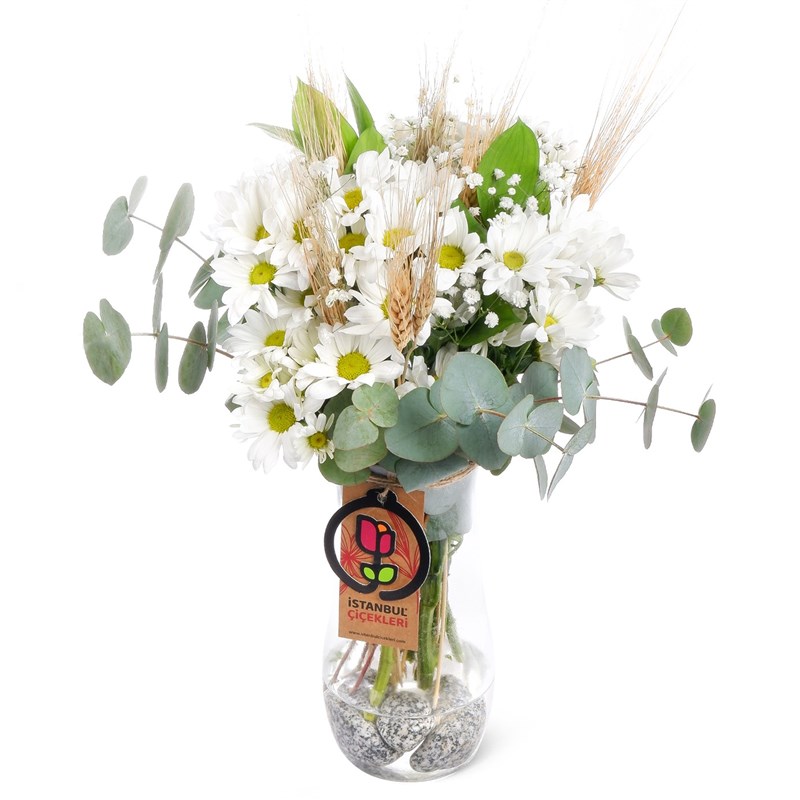 Ürünün boyutu ortalama 40-50 cm arasındadır. Beyaz papatya, saflık, masumiyet ve sadeliğin simgesidir. Aynı zamanda sadık sevgiyi, dürüstlüğü ve yeni başlangıçları temsil eder. Beyaz papatyalar, genellikle saf ve temiz duyguları ifade etmek için kullanılır, bu yüzden sevdiklerinize olan içten duygularınızı ve takdirinizi zarif bir şekilde iletmek için mükemmel bir seçimdir. Cam Aranjman Bakımı Hakkında Bilgilendirme; -Günlük bakımı için alt dallarının 1 cm olacak şekilde kesilmesi gerekir. -Vazoda bulunan suyun berrak olması gerekir. -2 günde bir suyunun değişmesi gerekir. -Ürünün serin yerde muhafaza edilmesi gerekir. -Solmuş veya bozulmaya başlayan ürünün yapraklarının temizlenmesi gerekir.
