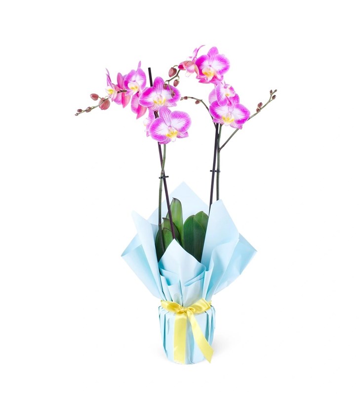 Yumuşak beyaz ve canlı pembe tonlarının uyum içinde buluştuğu bu özel orkide, zarafetle neşeyi bir araya getiriyor. Bu zarif çiçek, hem romantik hem de içten bir hediye alternatifi sunar. Yaklaşık 55-65 cm boyutundaki bu zarif çiçek, yaşam alanlarınıza doğal bir şıklık katmak için ideal. Her biri özenle seçilen bu özel orkide, İstanbul Çiçekleri ekibi tarafından büyük bir titizlikle hazırlanmıştır. Orkidenizin sağlıklı kalabilmesi için direkt güneş ışığı almayan ortamda bulunmamasına özen gösterin. Sulama işlemini haftada bir kez olacak şekilde, kök kısmına su gelecek biçimde yapın. Fazla su vermekten kaçının; toprağın tamamen kurumasına dikkat edin, çünkü fazla nem kök çürümelerine neden olabilir. Serin ve nemli ortamlar orkidenin gelişimi için en ideal koşullardır. Bu şekilde doğru bakım ile orkideniz uzun süre güzelliğini korur.