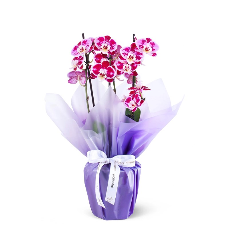 Benekli Mürdüm Orkide Aranjmanı Multi Midi Çift Dallı, çift dallı yapısı ve 30-35 cm boyuyla kompakt ama etkileyici bir duruş sergiler. Evinize ya da sevdiklerinizin yaşam alanlarına sofistike bir dokunuş katar. İki dallı yapısıyla hem gösterişli hem de dengeli bir duruş sergiler. Orkidenizin sağlıklı gelişimi için direkt güneş ışığından uzak, aydınlık bir ortam tercih edin; sulamayı ise haftada 1 kez, toprağın nem durumuna göre yapmanız yeterli olacaktır. İstanbul içi verdiğiniz siparişlerde aynı gün teslimat hizmetimizle, sevdiklerinize zamanında ve taze çiçekler ulaştırmanın mutluluğunu yaşıyoruz. Hızlı Teslimatlı Orkide