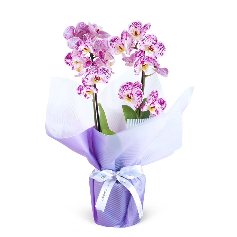 Mor Sarı Kırçıllı Orkide Aranjmanı Multi Midi Çift Dallı, çift dallı yapısı ve 30-35 cm boyuyla kompakt ama etkileyici bir duruş sergiler. Evinize ya da sevdiklerinizin yaşam alanlarına sofistike bir dokunuş katar. İki dallı yapısıyla hem gösterişli hem de dengeli bir duruş sergiler. Orkidenizin sağlıklı gelişimi için direkt güneş ışığından uzak, aydınlık bir ortam tercih edin; sulamayı ise haftada 1 kez, toprağın nem durumuna göre yapmanız yeterli olacaktır. İstanbul içi verdiğiniz siparişlerde aynı gün teslimat hizmetimizle, sevdiklerinize zamanında ve taze çiçekler ulaştırmanın mutluluğunu yaşıyoruz. Hızlı Teslimatlı Orkide