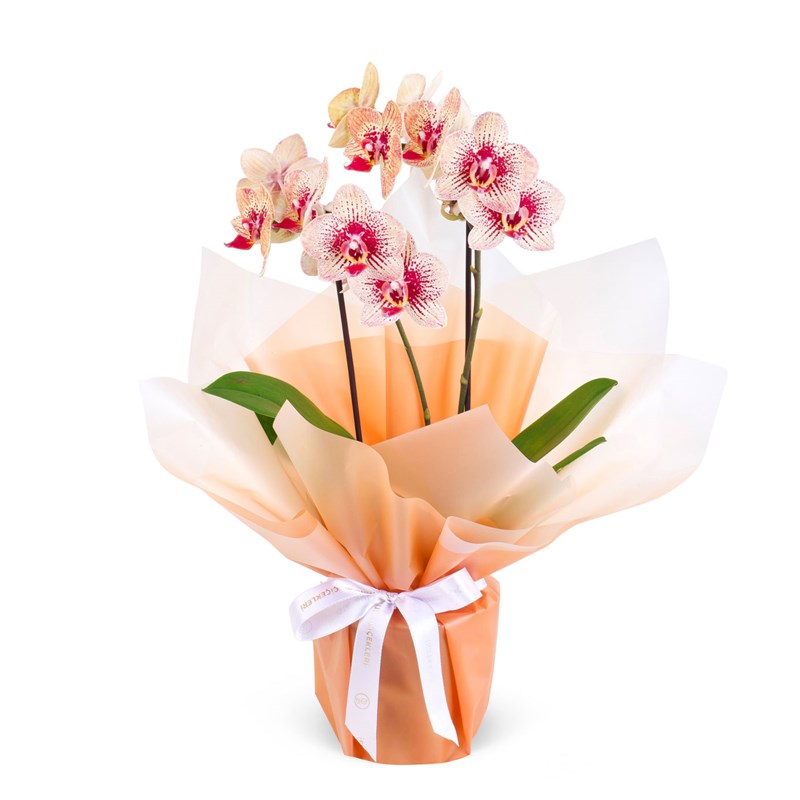 Turuncu Bordo Kırçıllı Orkide Aranjmanı Multi Midi Çift Dallı, çift dallı yapısı ve 30-35 cm boyuyla kompakt ama etkileyici bir duruş sergiler. Evinize ya da sevdiklerinizin yaşam alanlarına sofistike bir dokunuş katar. İki dallı yapısıyla hem gösterişli hem de dengeli bir duruş sergiler.