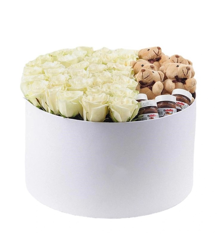Şık kutu içerisinde sunulan bu özel aranjman, hem romantik hem de eğlenceli bir hediye alternatifi sunar. Aşkın simgesi kırmızı güllerin yanında sevimli ayıcıklar ve tatlı Nutellalarla hazırlanan bu özel kutu, sevdiklerinize unutulmaz bir sürpriz yapmak için ideal bir seçimdir. Kutu içerisinde, 41-45 adet beyaz gül, 5 adet minik peluş ayıcık ve 4 adet mini Nutella yer alıyor.