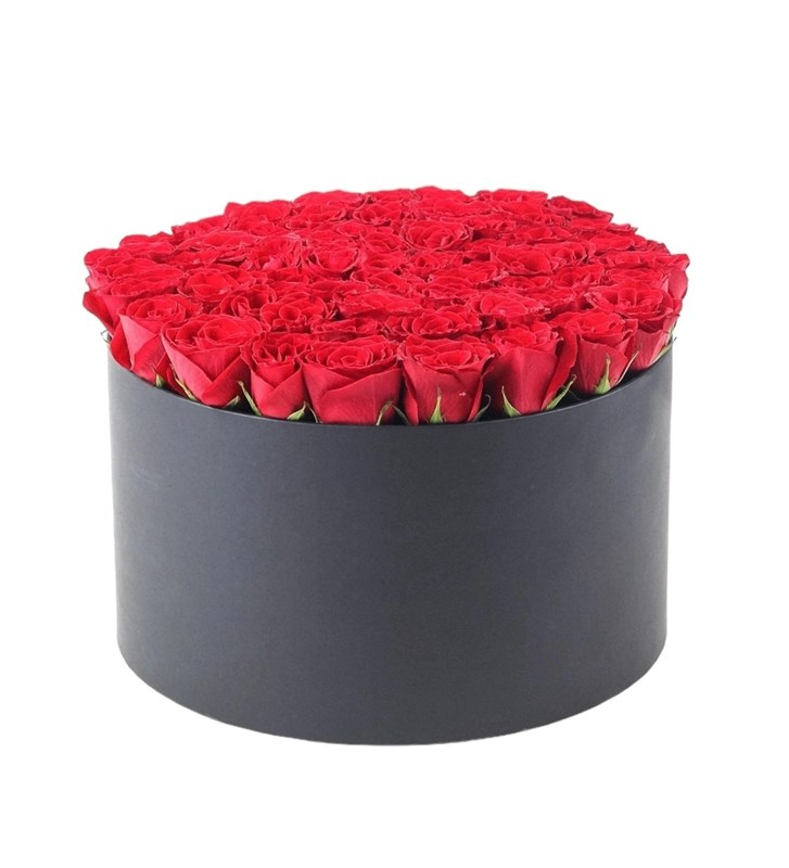 Kutuda 75-80 adet kırmızı gül bulunmaktadır. Kutu ebatları çap-yükseklik: 36x25 cm