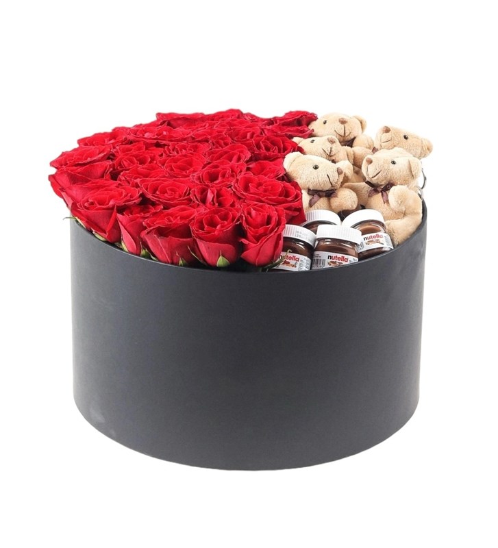 Kutuda 39-43 adet kırmızı gül 5 adet ayıcık ve 4 adet mini nutella bulunmaktadır. Kutu ebatları çap-yükseklik: 36x25 cm