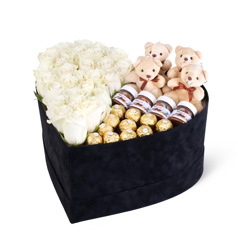 Süet kutudur. 37cm çapında, 20 cm yüksekliktedir. 28 - 30 adet ithal beyaz gül, 4 adet 10 cm ayıcık , 32 adet ferrero rocher çikolata ve 4 adet 25 gram mini nutella bulunmaktadır. Gül rengi mevsim koşullarına göre değişiklik gösterebilir. Kapağı mevcuttur. İstanbul içi özel kuryeler ile aynı gün teslimat , istanbul dışı yurt içi kargo ile gönderim sağlanmaktadır. Sevdiğinize sevginizi göstermenin en tatlı hali.