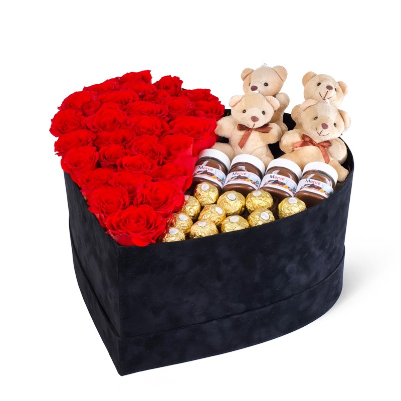 Süet kutudur. 37cm çapında, 20 cm yüksekliktedir. 28 - 30 adet ithal kırmızı gül, 4 adet 10 cm ayıcık , 11 adet ferrero rocher çikolata ve 4 adet 25 gram mini nutella bulunmaktadır. Gül rengi mevsim koşullarına göre değişiklik gösterebilir. Kapağı mevcuttur. İstanbul içi özel kuryeler ile aynı gün teslimat , istanbul dışı yurt içi kargo ile gönderim sağlanmaktadır. Sevdiğinize sevginizi göstermenin en tatlı hali.
