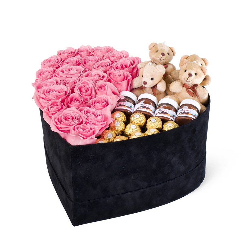 Süet kutudur. 37cm çapında, 20 cm yüksekliktedir. 28 - 30 adet ithal pembe gül, 4 adet 10 cm ayıcık , 11 adet ferrero rocher çikolata ve 4 adet 25 gram mini nutella bulunmaktadır. Gül rengi mevsim koşullarına göre değişiklik gösterebilir. Kapağı mevcuttur. İstanbul içi özel kuryeler ile aynı gün teslimat , istanbul dışı yurt içi kargo ile gönderim sağlanmaktadır. Sevdiğinize sevginizi göstermenin en tatlı hali.