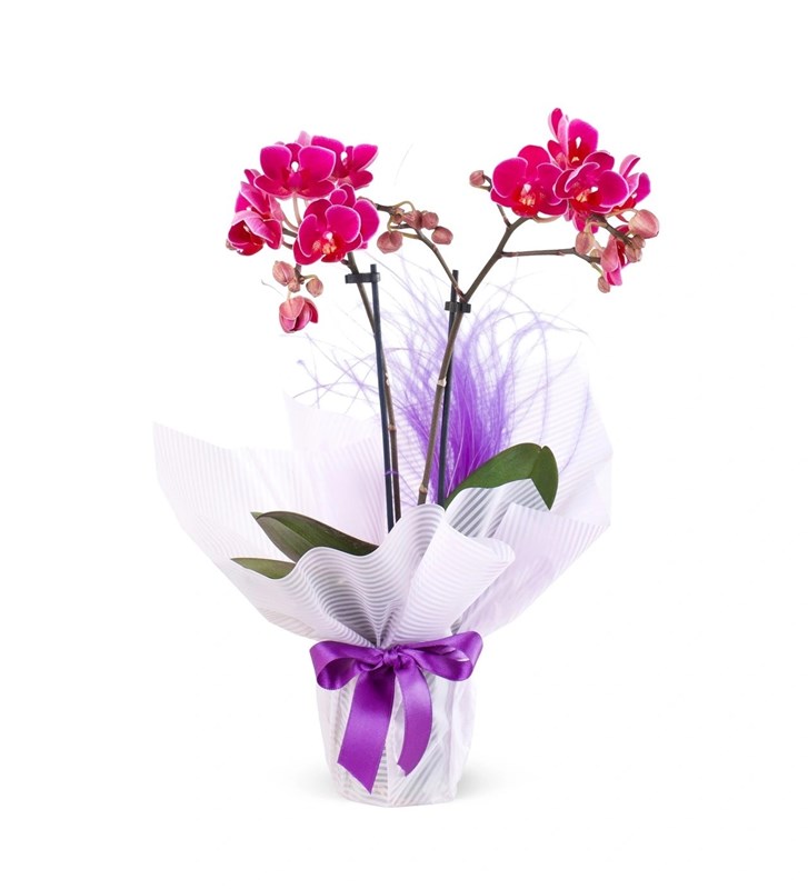 Ürünün boyutu 35-40 cm aralığındadır. Fuşya Orkide Aranjmanı Midi - 2 Dal, renklerin gücünü ve orkidenin zarafetini birleştiren özel bir tasarımdır. İki dalda açan fuşya orkide çiçekleri, canlı renkleriyle mekânlarınıza enerjik ve şık bir atmosfer katar. Fuşyaların derin ve zengin tonu, aranjmanı göz alıcı kılarak dikkatleri üzerine çeker. Fuşya Orkide Aranjmanı Midi - 2 Dal, enerjik ve şık tasarımı ile yaşam alanlarınıza renk ve zarafet katacaktır. Bu aranjman, doğanın canlı renklerini ve orkidenin zarafetini bir arada sunan mükemmel bir dekoratif seçenek oluşturur. Bakımı: Işık: Orkide, doğrudan güneş ışığından kaçınarak parlak, dolaylı ışık alan bir yerde büyür. Güneş ışığına doğrudan maruz kalmak, yaprakların yanmasına ve çiçeklerin solmasına neden olabilir. Sıcaklık: Aşırı soğuk ya da aşırı sıcak hava, orkidenin sağlıklı gelişimini engelleyebilir. Odanın nem seviyesini de göz önünde bulundurmak gerekir. Sulama: Orkide bitkisini sularken dikkatli olunmalıdır. Orkide, fazla suyu sevmez, bu nedenle toprağın üst kısmı kuruduğunda sulama yapılmalıdır. Sulama sırasında suyun saksının tabanında birikmemesine özen gösterin. Saksı altındaki delikler, suyun hızlı bir şekilde tahliye olmasını sağlamalıdır. Nem: Orkide nemli ortamlardan hoşlanır. Nem oranı düşük ortamlarda orkidenin yaprakları kuru ve solgun görünebilir.