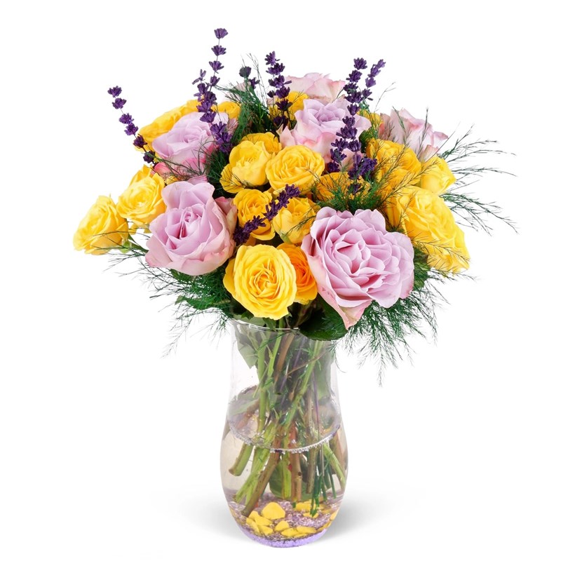 Neşeli ve zarif bir tasarım olan Güneş Bahçesi, lila ve sarının uyumunu şık bir cam vazoda sunar. Aranjmanda kullanılan lila Gül, sofistike ve zarif bir dokunuş katarken, sarı çardak gül aranjmana enerjik ve canlı bir atmosfer kazandırır. İstanbul Çiçekleri kalitesiyle hazırlanan bu özel tasarım, taze çiçeklerle elde edilir ve sipariş üzerine özenle hazırlanarak size ulaşır. Cam Aranjman Bakımı Hakkında Bilgilendirme; -Günlük bakımı için alt dallarının 1 cm olacak şekilde kesilmesi gerekir. -Vazoda bulunan suyun berrak olması gerekir. -2 günde bir suyunun değişmesi gerekir. -Ürünün serin yerde muhafaza edilmesi gerekir. -Solmuş veya bozulmaya başlayan ürünün yapraklarının temizlenmesi gerekir.