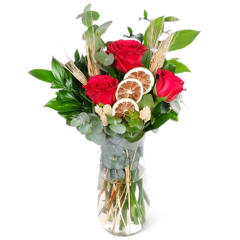 Ürünün boyutu ortalama 40-50 cm arasındadır. Kırmızı gül; Üçlü kırmızı gül, derin sevgi ve tutku sembolüdür. Genellikle romantik ilişkilerde kullanılır ve birine değer verdiğinizi ifade etmek için tercih edilir. Kırmızı güller, aşkın klasik sembollerindendir ve üç tane olması, bu duygunun özel bir anlam taşıdığını vurgular. Cam Aranjman Bakımı Hakkında Bilgilendirme; -Günlük bakımı için alt dallarının kesilmesi gerekir. -Vazoda bulunan suyun berrak olması gerekir. -2 günde bir suyunun değişmesi gerekir. -Ürünün serin yerde muhafaza edilmesi gerekir. -Solmuş veya bozulmaya başlayan ürünün yapraklarının temizlenmesi gerekir.