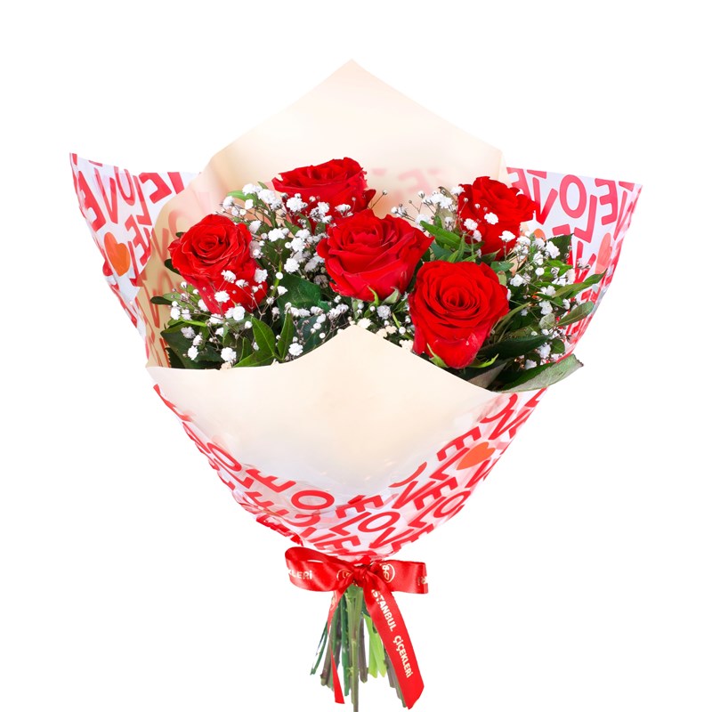 Ürünün boyutu 30 - 35 cm arasındadır. Kırmızı gül buketi, duygusal bir mesaj taşıyan zarif bir hediyedir. Bu özel buketin 5 adet gül içermesi de anlamını güçlendirir. Beş rakamı, sevgi dolu bir "seni seviyorum" mesajını ifade eder ve alıcıya olan hislerinizi net bir şekilde iletir. Beşli gül buketi, aynı zamanda bir ilişkiye olan bağlılığı ve sevginin daima büyümeye devam edeceği anlamını taşır. Buketlerin bakımında püf noktalar; * 2 günde bir suyunun değişmesi gerekir. * Her su değişiminde bitkinin alttan kökleri 1 cm kadar kesilmelidir. * Çiçeklerin suyunun devamlı berrak olmasına dikkat edilmesi tavsiye edilir.