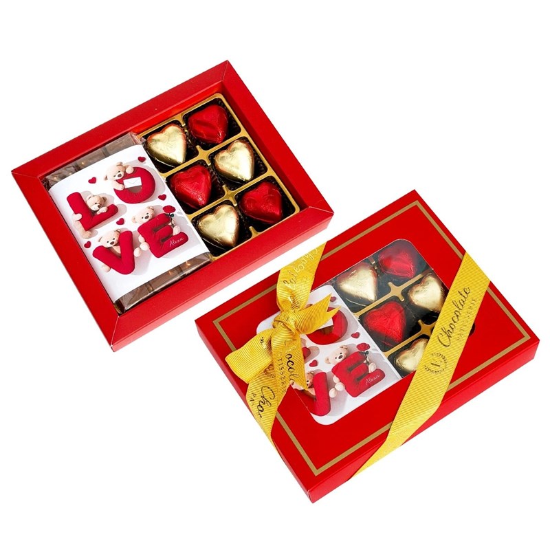 Ürünümüzde 150 gr baskılı tablet çikolata,6 adet sargılı kalp çikolata bulunmaktadır. Kutu ölçüsümüz 19,5x16x3,5 cm'dir. Ürünlerimizle alkol veya domuzların gibi maddeler kesinlikle bulunmamaktadır. Alerjen uyarısı: Süt tozu içerir,eser miktarda fındık,antep fıstığı,badem,yer fıstığı,susam,ceviz ve gluten içerebilir. Muhafaza Şartları: Serin ve kuru yerde (+18/22 C'de) muhafaza ediniz. Buzdolabına koymayınız.