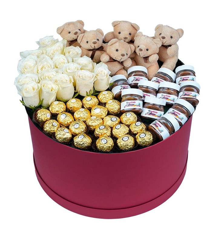 14-18 adet arası ithal beyaz gül 6 adet 10 cm ayıcık. 11 adet 25 gr nutella. 22 adet ferrero çikolata. 36 cm çapındadır. Kapağı mevcuttur.