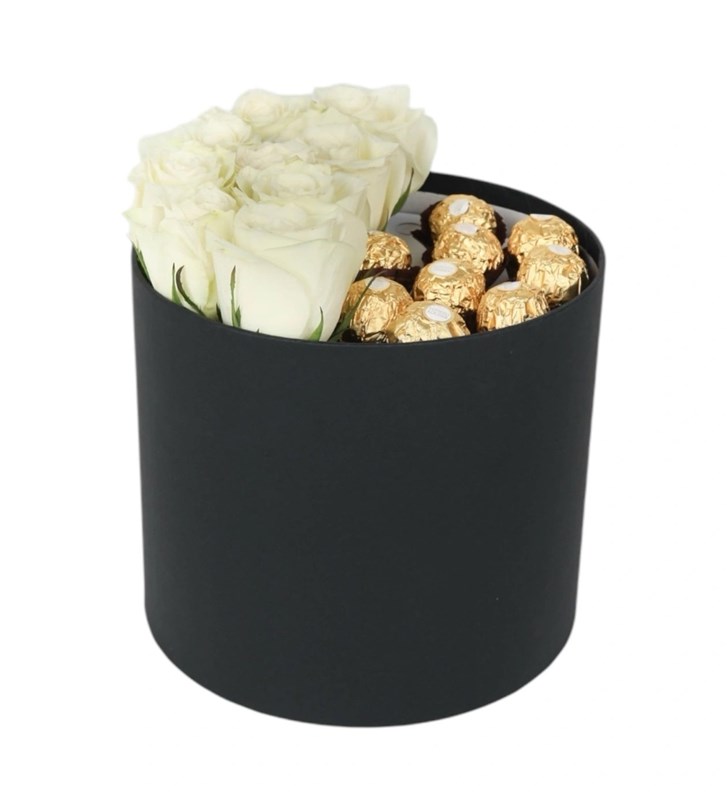 Kutuda 9 adet beyaz gül ve 9 adet ferrero rocher çikolata bulunmaktadır. Kutu ebatları çap-yükseklik: 21x23 cm