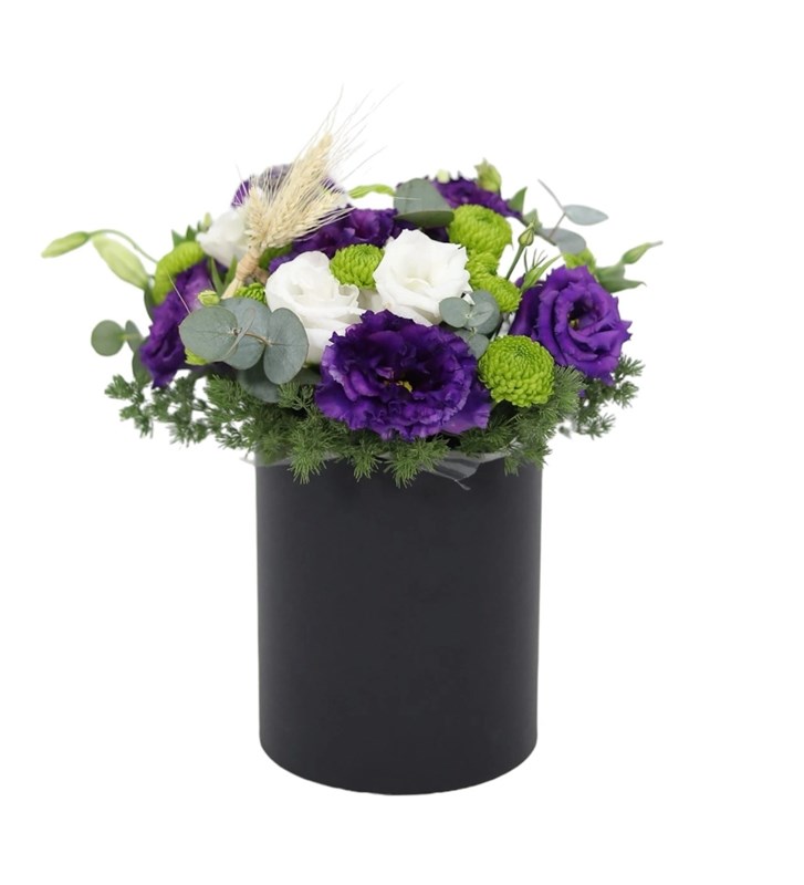Kutuda renkli lisyantus ve yeşil biçme bulunmaktadır. Kutu ebatları çap-yükseklik: 15x22cm