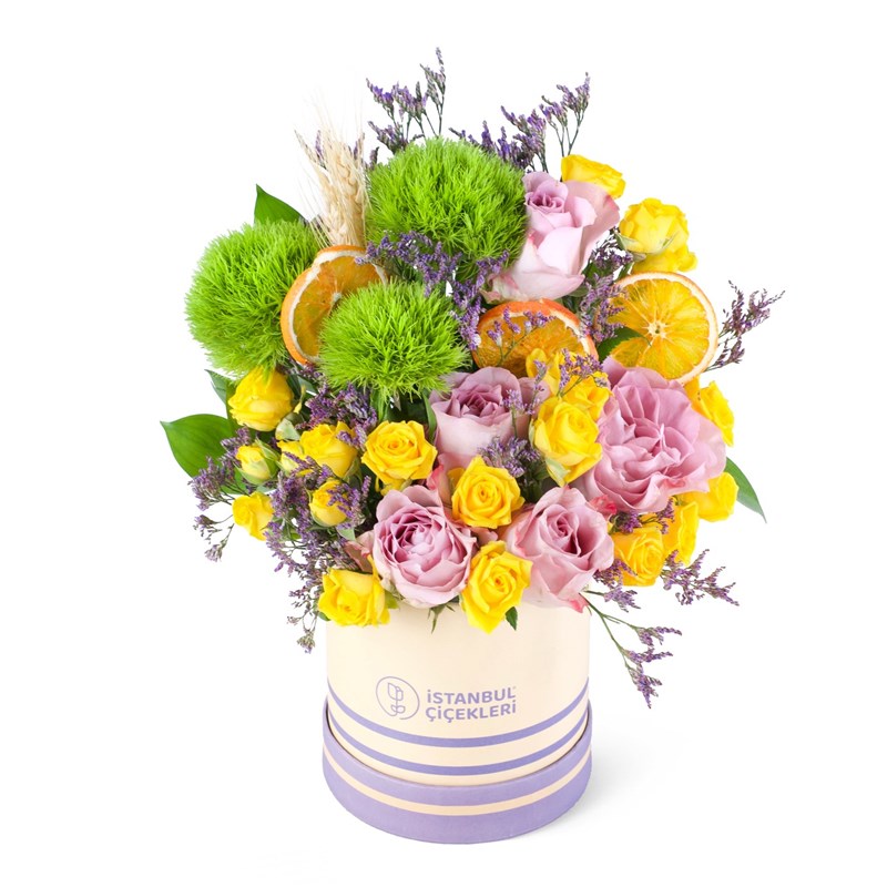 Ürünün boyutu 25-35 cm arasındadır. Lila Kutuda Lila Gül Aranjmanı, şıklığı ve zarafeti ile dikkat çeker. İçeriğinde lila gül ve sarı çardak gülü bulunan bu aranjman, renk uyumu ve zarif tasarımıyla her ortama zarafet katacak bir seçimdir. Lila gül, zarafetin ve şıklığın simgesidir. Sakin ve huzur veren rengiyle, romantizm ve gizem çağrıştırır. Bukette yer alan lila güller, aranjmana sofistike bir hava katarken, aynı zamanda görsel açıdan da oldukça etkileyicidir.
