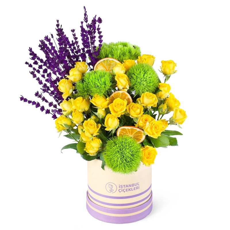 Ürünün boyutu 25-35 cm arasındadır. Lila Kutuda Sarı Çardak Gül Aranjmanı, zarafeti ve canlı renklerin mükemmel uyumunu yansıtan şık bir çiçek tasarımına sahiptir. İçeriğinde sarı çardak gülü bulunan bu aranjman, neşeli, pozitif ve canlı bir hava yaratırken, lila kutu ile mükemmel bir kontrast oluşturur. Sarı çardak gülü, mutluluk ve arkadaşlık simgesi olup, bu aranjman, özellikle enerjik ve samimi bir atmosfer yaratmak için ideal bir seçimdir. Lila Kutuda Aranjman, şık bir dekorasyon öğesi olarak evde veya ofiste harika bir seçenek sunar. Oturma odası, yatak odası veya çalışma masası gibi mekanlarda canlı ve pozitif bir atmosfer oluşturur. Ayrıca, doğum günleri, yıldönümleri, Sevgililer Günü gibi özel günlerde sevdiklerinize anlamlı ve zarif bir hediye sunabilirsiniz.