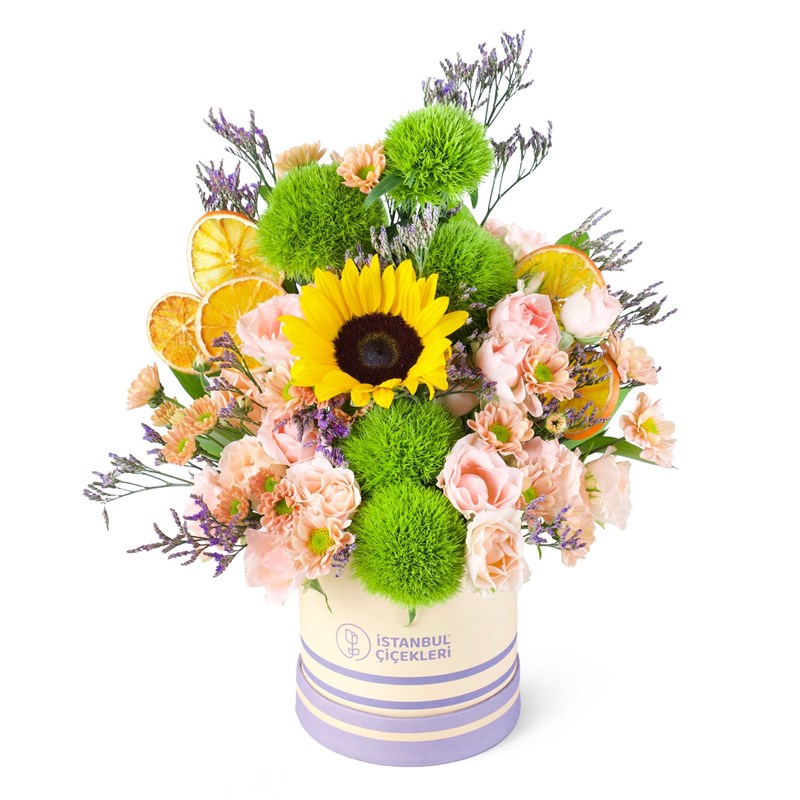 Ürünün boyutu 25-35 cm arasındadır. Lila Kutuda Aranjman, içerdiği lila gül ve sarı çardak gülü ile şıklığı ve zarafeti simgeler. Lila kutusu, çiçekleri zarif bir şekilde sunarak, aranjmanın şıklığını artırır. Hem evde hem de ofiste hoş bir dekoratif öğe olabilir, ayrıca özel günlerde hediye olarak tercih edilebilecek güzel bir seçenek sunar.