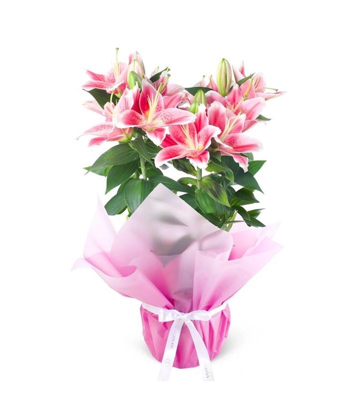 Ürün boyutu ortalama 65 cm'dir. Saksı boyutu 19 cm'dir. Saksıda pembe lilyum, zarafeti, inceliği ve şefkati temsil eden çiçeklerden biridir. Özellikle saksıda sunulan bir aranjman, doğanın canlılığını evinize ya da sevdiklerinize hediye etmenin modern ve estetik bir yoludur. Bu özel çiçekler, pembe tonlarının yumuşak ve romantik enerjisiyle duygusal bir derinlik taşır. Pembe zambaklar genellikle sevgi, hayranlık ve tatlı duyguların ifadesi olarak görülür. Sevgiyi ifade etmek için de mükemmel bir seçimdir. Pembe lilyum tomurcukları, kapalı halleriyle bile zarif bir duruş sergiler. Uygun ortam koşulları sağlandığında, birkaç gün içinde açmaya başlar ve kısa sürede tüm güzelliğini ortaya koyar. Tomurcukların açılmasıyla birlikte, lilyum bulunduğu mekana büyüleyici bir koku ve zarif bir atmosfer getirir. Bu eşsiz çiçek, sevginizi ifade etmenin en doğal yollarından biridir. Şefkati ve derin bağlılığı simgeleyen pembe lilyum, sevdiklerinizin kendilerini özel hissetmesini sağlar. Her bir çiçeğin açılışı, hayatınızdaki önemli insanlara olan sevginizi ve hayranlığınızı dile getirmenin zarif bir yoludur. Pembe kokulu lilyum, yalnızca bir çiçek değil, aynı zamanda saf duygularınızı taşıyan bir mesajdır. Güzelliği ve büyüleyici kokusuyla, bu özel çiçek bulunduğu her ortamı canlandırır ve anlam dolu bir hediyeye dönüşür. Bakımı için dikkat edilmesi gereken şeyler; *Çiçeğinizin rahatça büyüyebileceği uygun boyutta bir saksı tercih edin. *Toprağın nemli kalmasını sağlamak için düzenli olarak su verin, ancak köklerin su içinde kalmadığından emin olun. *Direk güneş ışığından kaçının. Çiçeğinizin serin ve gölgeli bir ortamda bulunması, sağlığını ve ömrünü uzatacaktır. * Toprağın üst kısmının kurumasını bekleyin ve sulamadan önce toprağın nemini kontrol edin.