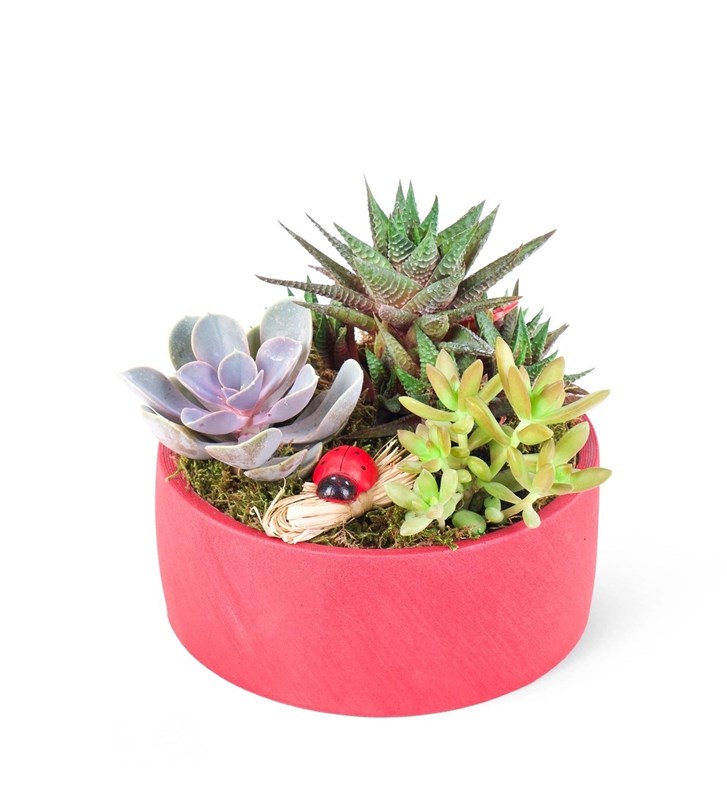 Ürün boyutu 15-20 cm aralığındadır Saksıda sukulent bahçesi, farklı türdeki sukulentlerin uyumunu bir araya getirerek doğal ve şık bir görünüm sunar. Dayanıklı yapısı sayesinde uzun süre canlı kalan bu özel aranjman, dekoratif tasarımıyla ev ve ofis ortamlarına modern bir hava katar. Teraryum havası veren kırmızı sukulent bahçesi, sevdiklerinize hediye etmek için de ideal bir seçimdir.