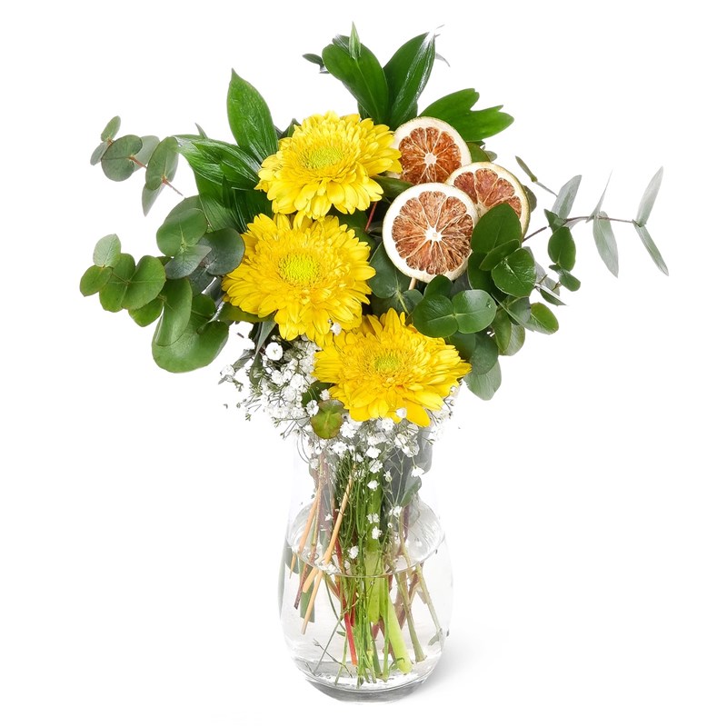 Ürünün boyutu 30-35 cm aralığındadır. Sarı Gerbera Aranjmanı - Bozburun, sıcak yaz günlerinin enerjisini ve neşesini simgeleyen zarif bir tasarımdır. Sarı gerberalar, mutluluk, iyimserlik ve dostluğun simgesidir. Bu çiçekler, parlak sarı tonlarıyla çevresine enerji yayar, insanın ruhunu canlandırır ve etrafındaki herkese pozitif bir atmosfer sunar. Cam Aranjman Bakımı ; *Günlük bakımı için alt dallarının 1 cm olacak şekilde kesilmesi gerekir. *Vazoda bulunan suyun berrak olması gerekir. *Ürünün serin yerde muhafaza edilmesi gerekir. *Solmuş veya bozulmaya başlayan ürünün yapraklarının temizlenmesi gerekir.