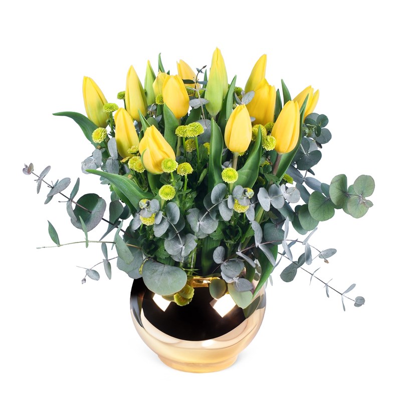 Zarafeti ve pozitif enerjiyi bir araya getiren bu şık aranjman, canlı sarı laleler ve yeşil krizantemlerin uyumuyla göz alıcı bir görünüm sunar. Sarı laleler mutluluk, umut ve yeni başlangıçları simgelerken; yeşil tonlar tasarıma tazelik ve doğallık katar. Doğum günü, yeni iş tebriği, teşekkür hediyesi ya da içten bir “geçmiş olsun” mesajı için tercih edebileceğiniz sarı lale aranjmanı, bulunduğu ortama ışık ve canlılık kazandırır. Taze ve özenle hazırlanan bu modern kutu çiçek tasarımı, sevdiklerinize zarif ve unutulmaz bir sürpriz yapmanın en şık yollarından biridir.