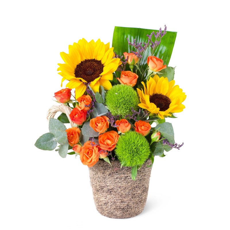 Ürünün boyutu 30-35 cm aralığındadır. Doğanın sıcak dokusunu evinize veya sevdiklerinizin özel anlarına taşıyan bu aranjman, göz alıcı ayçiçekleriyle dikkat çeker. Sepetin zarif yapısına eşlik eden turuncu çardak çiçekleri, enerji dolu bir atmosfer yaratırken, okaliptus yapraklarının ferahlatıcı yeşili aranjmana sofistike bir hava katıyor. Kuru bitkilerle zenginleştirilmiş detaylar, bu aranjmana doğal bir doku kazandırarak her mekânda sıcak bir köşe oluşturur. Şık gümüşlük tasarımı, hem modern hem de klasik dekorasyonlarla uyum sağlar. Sevdiklerinize anlamlı bir hediye sunmak ya da kendi yaşam alanınızı güzelleştirmek için ideal bir tercih! Bu özel tasarım, doğanın güzelliklerini ve sıcak renklerini bir araya getiriyor.