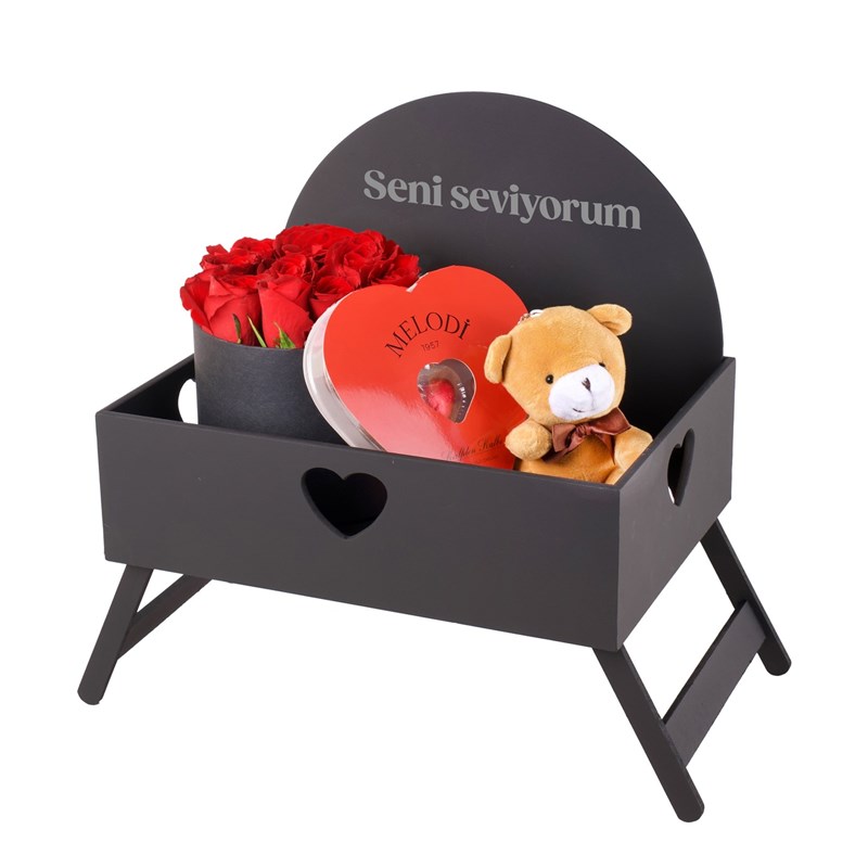 Şımarık Ahşap Tepside Kırmızı Güller, Ayıcık ve Kalp Çikolata