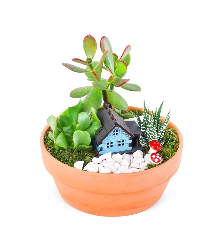 Ürün boyutu 15-20 cm aralığındadır. Doğallığın ve modern tasarımın buluştuğu Terracota Mavi Ev Sukulent Aranjmanı, dekorasyonunuza estetik bir dokunuş katıyor. Dayanıklı ve az bakım gerektiren sukulentler, mavi ev desenli özel terracota saksı ile birleşerek hem şık hem de uzun ömürlü bir aranjman oluşturuyor. Sevdiklerinize hediye olarak tercih edebileceğiniz bu özel sukulent aranjmanı, yaşam alanlarınıza ferahlık ve zarafet kazandırır. Terracota Mavi Ev Sukulent Aranjmanı, İstanbul Çiçekleri tarafından özenle hazırlanır ve aynı gün teslimat imkânıyla sevdiklerinize ulaştırılır.