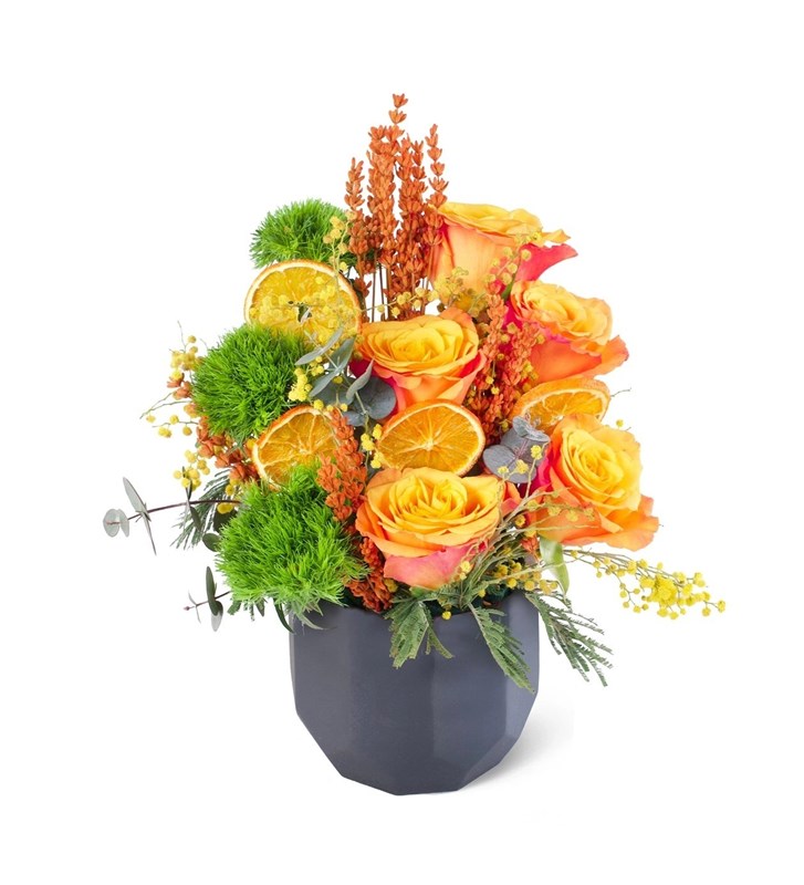 Ürünün boyutu 30-35 cm aralığındadır. Turuncu Gül Aranjmanı Glow Sunset,sıcak turuncu güllerinin enerjik tonları ve doğal öğelerin mükemmel birleşiminden oluşur. Turuncu güller, aranjmanın odak noktasını oluşturur ve parlak renkleriyle dikkat çeker, enerjik ve canlı bir atmosfer yaratır. Kuru bitkiler, aranjmanın doğal ve şık görünümünü pekiştirirken, zarif dokuları ile güllerin renklerini öne çıkarır. Okaliptus, ferahlatıcı yeşil yaprakları ve hoş kokusu ile aranjmana taze bir hava katar, ayrıca doğal bir denge sağlar. Bu aranjman, sıcak ve zengin tonlarıyla bulunduğu her ortama dinamizm ve şıklık katar. Hem iç mekanlarda dekoratif bir öğe olarak kullanılabilir hem de özel günlerde anlamlı bir hediye olarak tercih edilebilir. Özellikle doğum günleri, tebrikler, yıldönümleri gibi kutlamalar için mükemmel bir seçenek sunar. Ayrıca evde veya ofiste kullanıldığında, enerjik ve zarif bir atmosfer yaratarak mekâna ferahlatıcı bir dokunuş ekler.