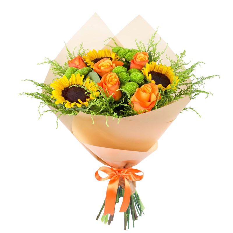 Ürünün boyutu 30-35 cm aralığındadır. Enerjik, neşeli ve tam anlamıyla göz kamaştırıcı bir buketle karşınızdayız! Turuncu Gül ve Ayçiçeği Buketi, güneşin sıcaklığını, doğanın neşesini ve rengarenk bir coşkuyu içinde barındırıyor. Buketimizin yıldızı olan ayçiçekleri, güneşe olan aşklarıyla ortamınıza ışık ve pozitif enerji yayıyor. Onların çevresinde yer alan turuncu güller, sıcacık bir sevgi ve heyecan fırtınası estiriyor. Her bir yaprağı, mutluluğunuzu ifade etmek için adeta dans ediyor. Buketi tamamlayan yeşil krizantemler, doğanın dinginliğini ve tazeliğini katarken, solidaster çiçekleri aranjmana ince ve zarif bir dokunuş ekliyor. Bu çiçekler bir araya geldiğinde, hem eğlenceli hem de şık bir uyum yakalıyor. Buketlerin bakımında püf noktalar; * 2 günde bir suyunun değişmesi gerekir. * Her su değişiminde bitkinin alttan kökleri 1 cm kadar kesilmelidir. * Çiçeklerin suyunun devamlı berrak olmasına dikkat edilmesi tavsiye edilir.